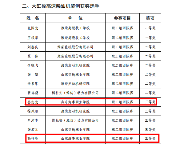 本次比赛,航海学院派出了由孙志元老师、高祥峰老师组成的教师组和由赵锦焜同学、刘琳同学组成的学生组两支参赛队伍,由领队兼副裁判长陈勇老师带队三次去潍柴职工大学培训学习。经过激烈的3天理论考试和现场实践操作的综合比赛,在46个参赛队伍中,教师组和学生组都取得三等奖的好成绩。赵锦焜和刘琳同学还获得了竞赛“优秀选手”的荣誉称号,并获得潍柴集团“人才绿卡”资格,可以免试引进潍柴集团服务。