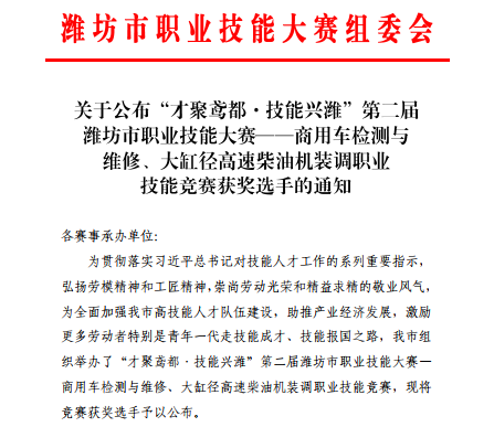 “才聚鸢都·技能兴潍”第二届潍坊市职业技能大赛——商用车检测与维修、大缸径高速柴油机装调职业技能竞赛由潍坊市人力资源和社会保障局主办,潍柴控股集团有限公司承办,山东交通职业学院山东海事职业学院山东英创天元教育科技有限公司协办。大赛设计了36项赛事,70个赛项,基本涵盖了传统基础、新兴产业、乡村振兴、现代服务、食药安全、技工教育等行业,比赛获奖选手为全市经济高质量发展提供了强有力的技能人才支撑。