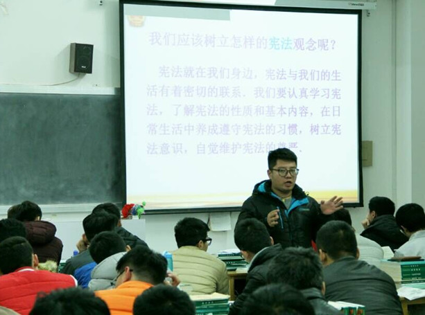 为了深入开展法制宣传教育,使同学们成为一个知法、守法、懂法的合格大学生;做一个了解法律知识、懂得用法律来保护自己的合格公民。航海学院2015级轮机1/2班按照学院工作部署,于十二月五日晚自习时间,借助“国家宪法日”在2320教室举行“学宪法,讲宪法”主题班会。