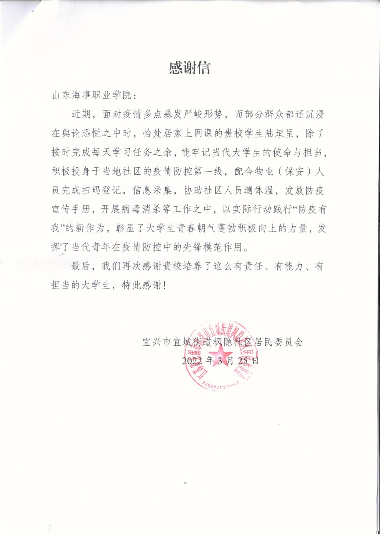 他是这一个朴实无华,平凡的大学生,收到了来自宜兴市宜城街道枫隐社区的感谢信,感谢信中肯定了我校学子有责任、有能力、有担当。在疫情面前,用实际行动践行新时代大学生的使命与担当。