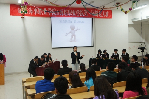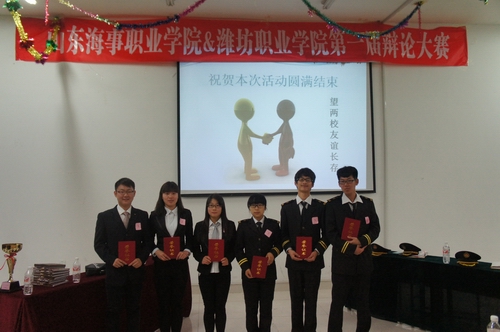 为了促进两校之间的交流和学习,增进彼此之间的友谊。2014年4月13日下午,我院联合潍坊职业学院举办了滨海大学城建立以来首次大学生校际辩论赛。两校围绕“朽木是否可雕”为辩题展开辩论。