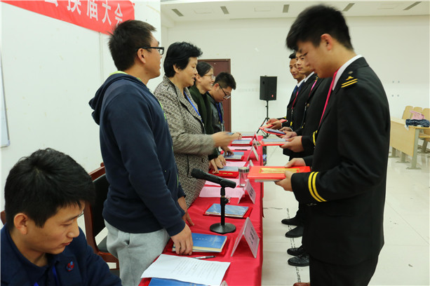 大会在王涛涛书记的致辞中拉开了帷幕,第四届航海学院各部部长、副部长上台领取了荣誉聘书。接下来第三届学生会主席翁凯分享了在学生会的收获并表达了对学生会的祝愿。然后本届学生会主席宋天宇代表第四届学生会成员上台表态演讲。随即,党总支书记对学生会干部进行了要求,她要求学生干部,首先是学生,要不忘初心,努力学习,做学习的模范;其次学生干部是老师的助手,是架起学生和老师的桥梁、纽带,是要在工作实践中锻炼成长,增长才干;三是做一名有家国情怀、有理想、有担当的、综合素质较高的大学生。四是希望各位部员能立足岗位创新性的开展工作,以积极乐观的心态传递正能量。