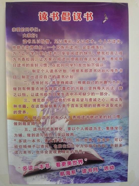 此次活动旨在将航海系打造成为文明涵养、积极向上、团结一致、乐观健康的优秀集体。为了让同学们爱上读书,享受阅读的快乐,使我校真正成为书香校园,让大家在阅读中提高自身文化素养,养成每日读书的良好习惯,在此向同学们发出如下倡议: