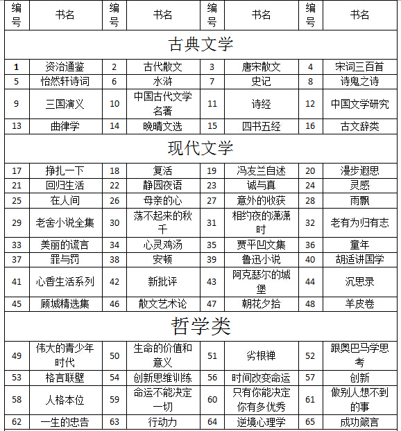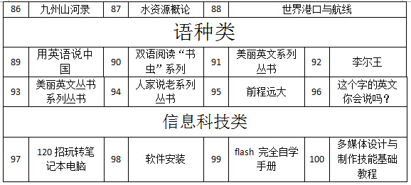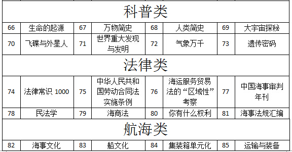 “多读一本书,看更美世界”。在书中,可以给你精神予以寄托,也能在迷茫中为你指引方向。不妨多读几本书,也许会发现更精彩的世界。在此,向同学们推荐100部值得一看的书,同学们可任意从中自选3本,在一个月内借阅完毕。通过推动读书活动,促使我系同学们的读书形成习惯,使航海系同学们的学习氛围浓郁起来。活动结束前征集学生的读书感受,发起征文与朗诵比赛,表现优秀者予以奖励。航海系向同学们推荐的100本书是: