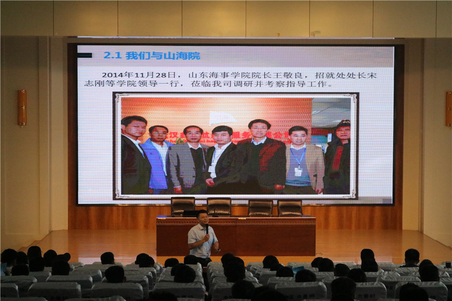 在宣讲过程中,首先由航海学院团总支部书记王涛涛代表学校向各位企业家的到来表示欢迎和感谢,并针对当前的就业形势与就业政策,对我校毕业生的就业情况作了简单的介绍和分析。随后,各家企业负责人从公司概况、企业文化、企业员工培养模式、企业目前的发展状况及发展前景与同学们作了详尽的介绍。在宣讲会的互动环节,同学们也就自己所关心的专业对口、企业所需求的人才素质、公司发展平台与机会等问题与企业家们进行了互动交流,企业家们纷纷认真作答,并多次强调“选择”对于大学生的重要性,希望同学们都能找到自我实现的价值与目标,并为之而努力奋斗。宣讲会场面十分热烈,掌声不断。