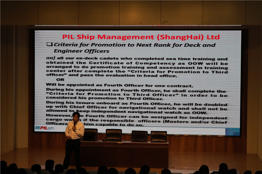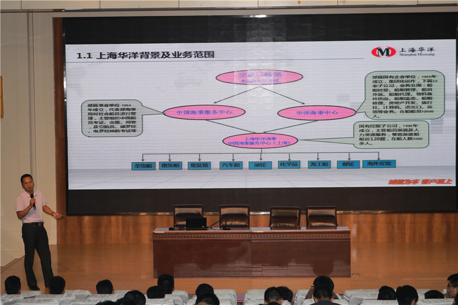 为提升学生技能,加深行业认识,航海学院企业校园招聘宣讲会于9月12日下午在图书馆报告厅举行。此次宣讲会邀请了武汉鑫汇航船务公司、威海国际经济技术合作股份有限公司、青岛颐和润丰国际船舶管理有限公司、新加坡ISM船舶管理公司船员公司、上海鹤圣船舶科技有限公司、山东海运股份有限公司、上海华洋海事服务有限公司及厦门兴诺信船务有限公司八家企业负责人来校,为在校生做企业宣讲。航海学院院长助理刘继峰、全体辅导员老师及2016级航海类专业全体同学参加了此次宣讲会。