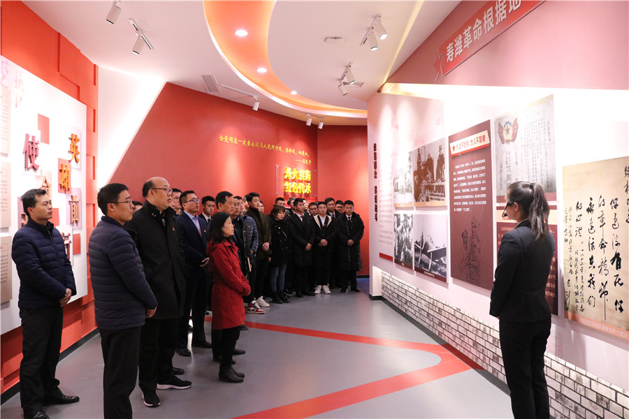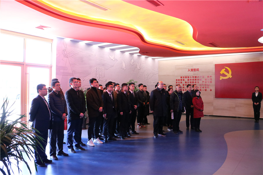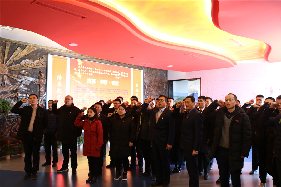 在展馆序厅,面对中国共产党党旗,全体党员同志表情严肃,郑重的举手握拳,重温入党誓词,牢记使命担当。