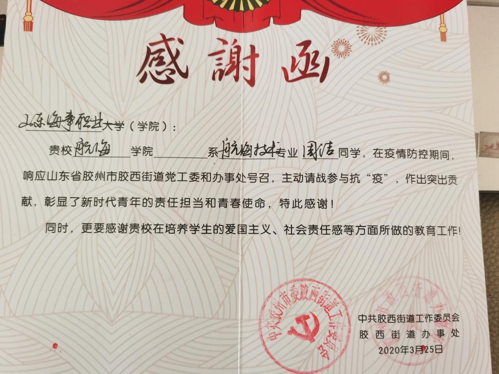 日前,山东省胶州市胶西街道党工委和办事处向我校发来感谢函,对2018级航海技术专业1班周洁同学在疫情防控工作中的辛劳付出表示感谢。信函中对周洁同学的志愿服务工作予以认可和称赞,也对学校在培养学生的爱国主义、社会责任感等方面所做的教育工作表示了感谢。