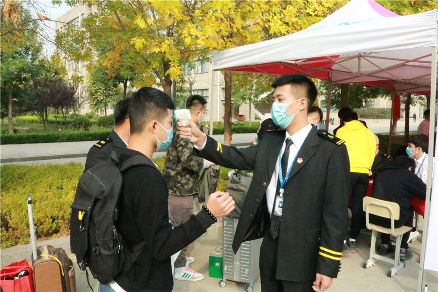 在学生通道,工作人员认真查验新生绿色健康码并进行体温检测,检验合格的学生即可到报道专区办理报到手续。