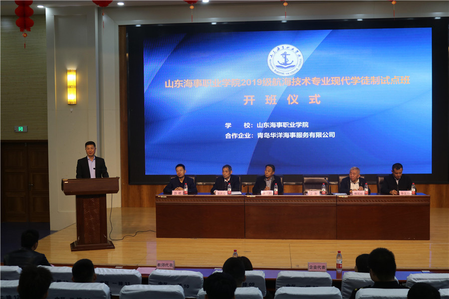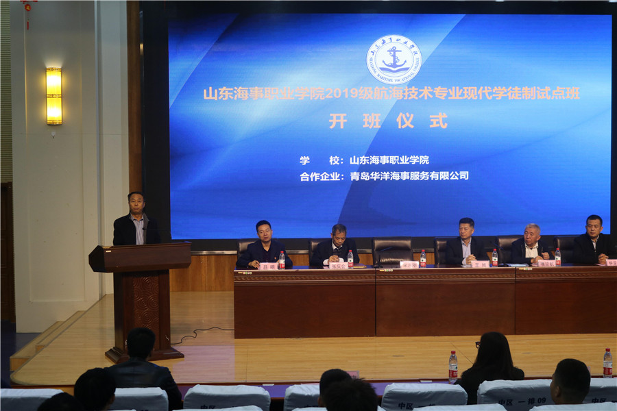 为进一步加快推进学校现代学徒制试点工作,深化产教融合、校企合作双主体育人机制,提升人才培养质量,11月12日下午,学院在图书馆报告厅隆重举行2019级航海技术专业现代学徒制“华洋班”开班仪式。青岛华洋海事服务有限公司副总经理王旭、隋延航,山东海事职业学院副校长宋志刚、张庆会、吕明,担任华洋班授课任务的企业师傅代表,校内任课教师代表,2019级现代学徒制班全体学生参加本次开班仪式。仪式由航海学院副院长李晓伟主持。