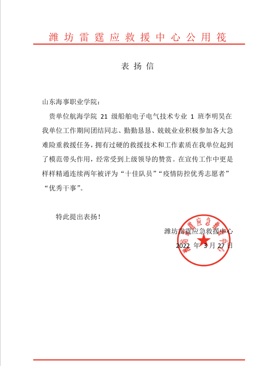 李明昊,男,中共预备党员,山东海事职业学院航海学院21级船舶电子电气技术专业学生,除了是一名在校大学生外还有另一个身份——潍坊雷霆应急救援中心综合勤务部干事、寒亭区人民武装部干事、基干民兵。