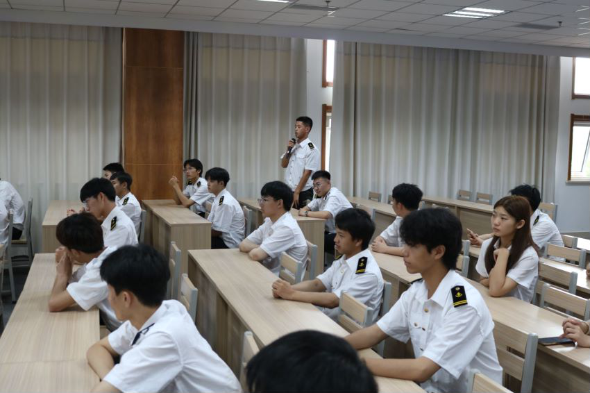 活动现场,张德强主任结合自身从事海事监管执法及从事过的船舶轮机长的双重工作经历,通过对威海4·19“中华富强”轮火灾、韩国世越号沉船、8·12天津滨海新区爆炸等几个真实安全事故典型案例分析,引导同学们牢固树立安全无小事、责任大于天的意识,劝诫同学们要时刻绷紧安全这根弦,坚决做到思想认识到位、预防措施到位、责任落实到位。他勉励同学们要通过不断加强航海专业知识学习和专项技能提升,以后在工作中杜绝该类事故的发生,确保船上人员生命和财产的安全。在交流互动环节,张主任对同学们提出的关于船舶航行安全、海员职业生涯规划、船上生活及工作状况等关切问题进行了细致解答,帮助同学们坚定走向深蓝、立志成为高素质船员的意志和决心。