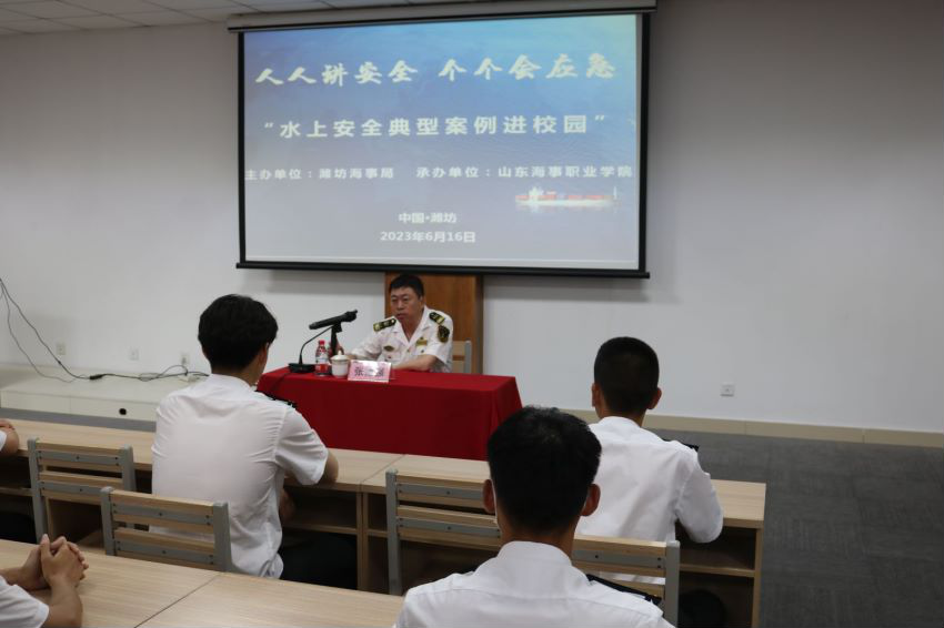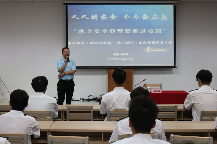 在6月全国各行各业齐抓共管促安全生产之际,为进一步加强航海类专业学生水上安全素养和安全技能培养,积极营造社会各界关注水上交通安全的良好氛围,由潍坊海事局主办、山东海事职业学院承办的“水上安全典型案例进校园”活动于6月16日下午在学校第二信息化教室举办。潍坊海事局政务中心主任张德强、山东海事职业学院副校长吕明及航海类专业学生代表参加本次活动。