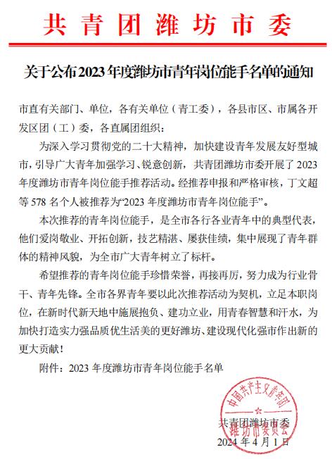 近日,共青团潍坊市委印发《关于公布2023年度潍坊市青年岗位能手名单的通知》,航海学院纪政辉、杜敏、潘琰三位教师被评为2023年度“潍坊市青年岗位能手”。
